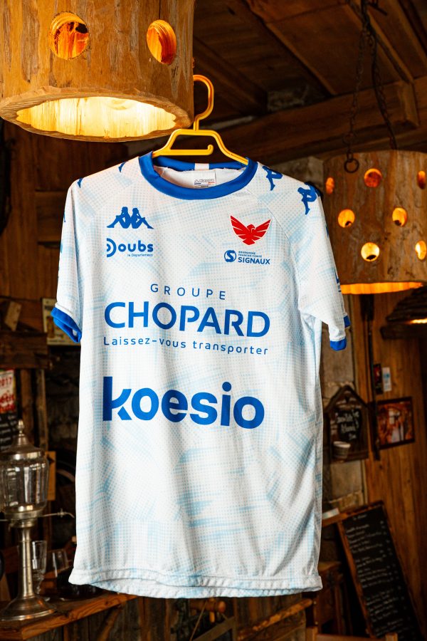 Le design blanc et bleu marine, d’inspiration épurée, rend hommage à l’aigle symbolique du club, incarnant fierté, combativité et lien historique à la ville de Besançon